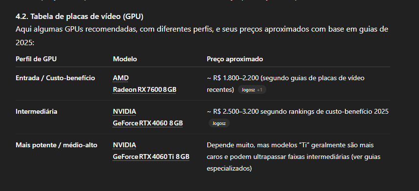 Também há GPUs de nível mais alto (por exemplo, RTX 5070, RX 9070 XT) citadas em guias recentes. Syxt Tech+2Adrenaline+2